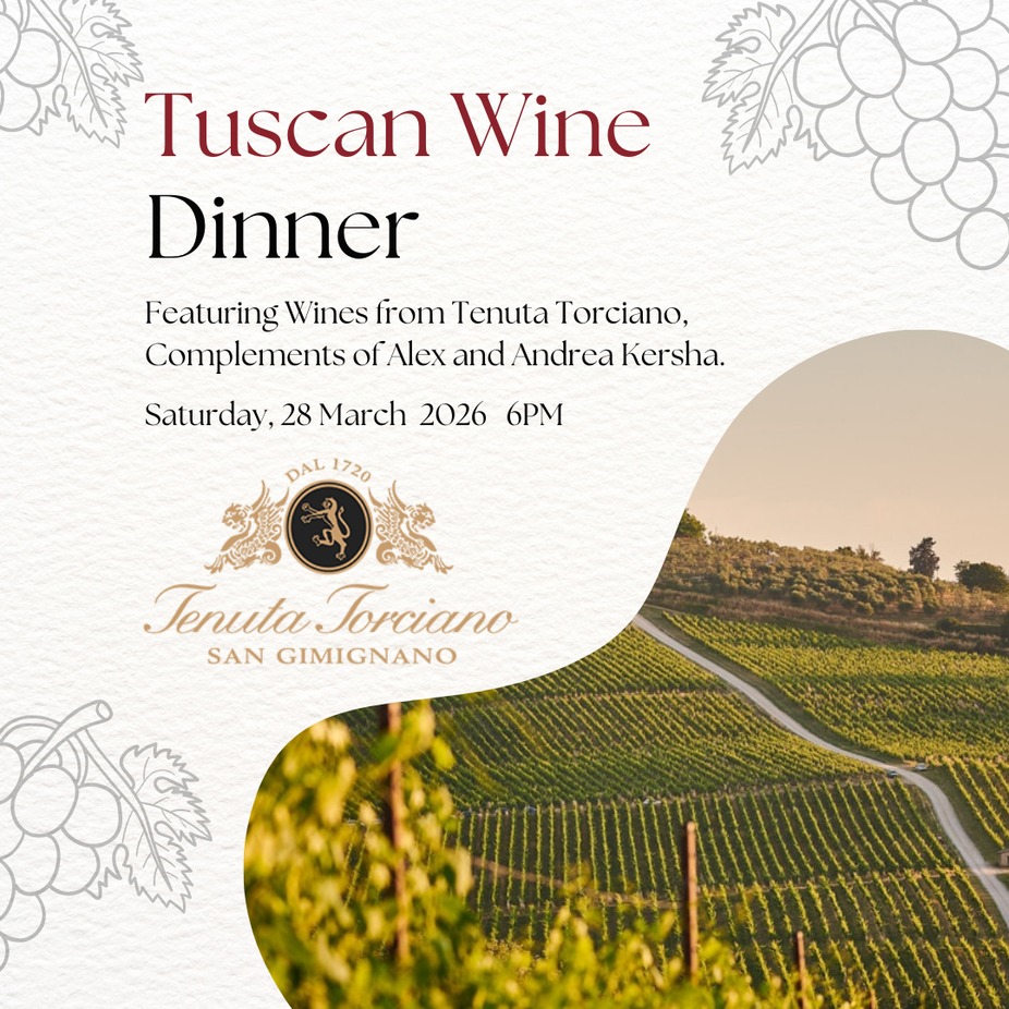 We are delighted to invite you to a special Tenuta Torciano Wine Dinner, with wines generously donated by new members Alex and Andrea Kersha, who have just returned from visiting this celebrated Tuscan winery. After experiencing the wines firsthand—walking the vineyards, tasting at the source, and soaking in the spirit of the region—they knew they had to share these extraordinary selections with our Club.