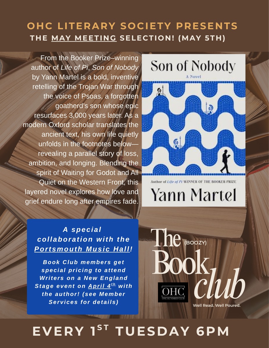 On May 5th, the Club will turn its attention to Son of Nobody, the newest work from Yann Martel. Known for his Booker Prize–winning novel Life of Pi, Martel returns with a bold and inventive reimagining of the Trojan War—told through the eyes of an unlikely narrator whose voice has been lost to history. Blending ancient epic with modern narrative, the novel unfolds on two levels: a rediscovered poetic text and the deeply human story of the scholar translating it. The result is a layered exploration of ambition, obscurity, love, and the enduring search for meaning—reminding us that even the quietest lives can echo across centuries.